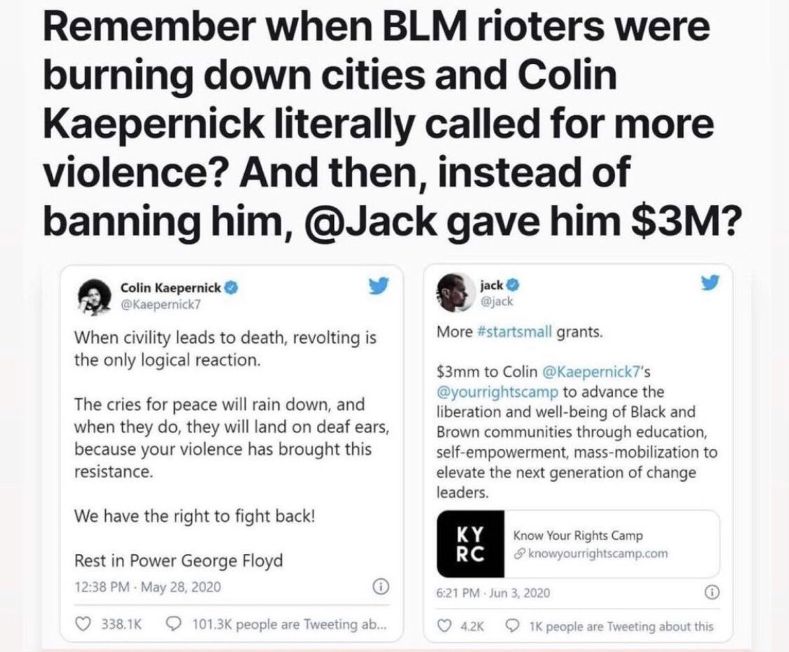 Colin Kaepernick used the word “fight” in the above tweet on the 28th of May, at the exact moment when it literally meant setting Minneapolis aflame and doing what you could to kill, maim, or injure cops. Then a few days later, after Kaepernick’s call to arms had played a major part in the riots spreading across the nation, Dorsey proudly announces that he is rewarding him by dropping $3 million into his lap. And this is the sanctimonious sh*t who is preaching to us and deplatforming a duly elected President for “incitement to violence” even though Trump (a) never told his supporters to storm the Capitol and (b) quickly denounced those who had committed crimes by doing so.