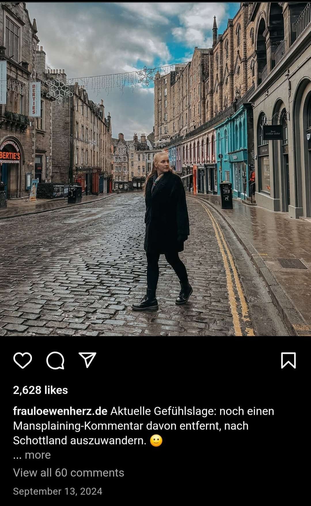 Leonie Plaar walking about the streets of Edinburgh, a perfect juxtaposition of European society and culture on one hand and the archetype of a certain group of individuals working headlong not just for the demise of Germany and the German people, but European civilization and posterity writ large. Her phenotype, including pale skin, long blonde hair, and a statuesque frame augments this juxtaposition. Dressed in black attire, she appears like a fallen Valkyrie, irretrievably corrupted and tainted by a pernicious cultural milieu that has been installed by the Western Allies and tirelessly cultivated after Germany’s capitulation.