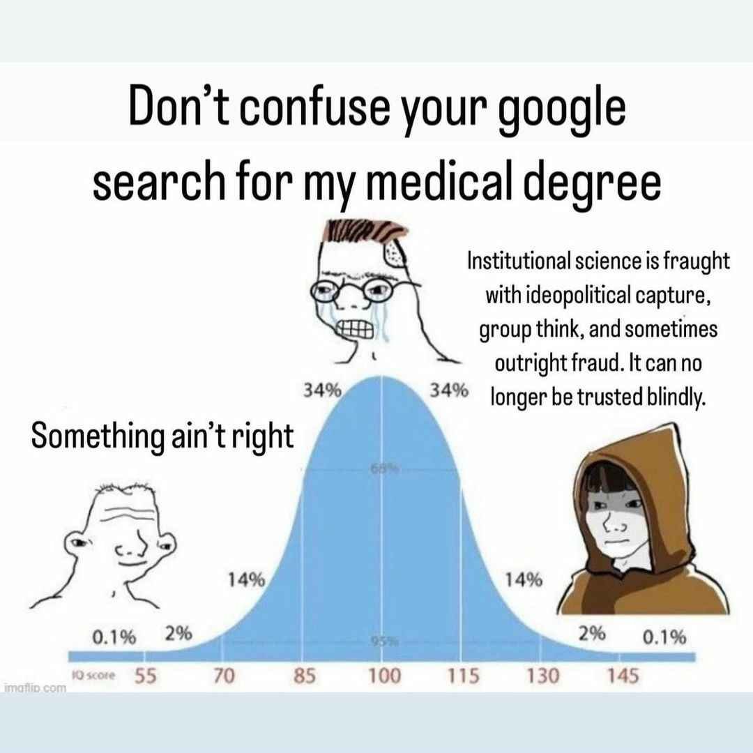 11 The problems with such reasoning are well beyond the scope of this essay. In summary, as revealed in the meme featured in the text of this essay, various institutions, including organizations in healthcare and medicine have been subject to ideopolitical capture. Beyond that, consider a staple address to medical students on their first day, namely that one third to one fourth of what is taught is likely wrong, it is just unknwon at that time what is wrong. There are of course many other objections.
