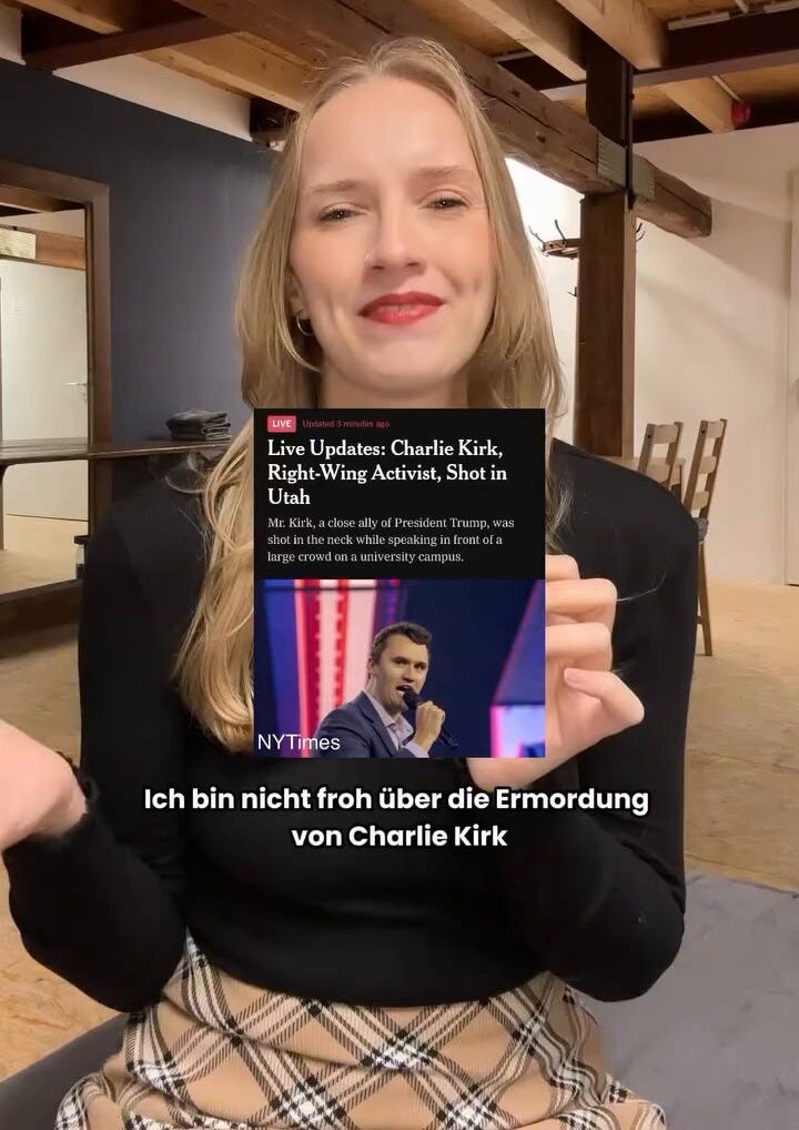 Screenshot of Leonie Plaar’s German language TikTok video stating that while she is not happy about Charlie Kirk’s assassination, she is not sad about it either, as she refuses to condemn those who condone or celebrate his death. This is tantamount to condoning to circumvent terms of service. It is also of note she did not post this on her more accessbile English language TikTok accouunt.
