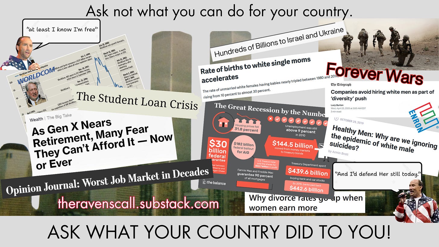 While the stanza presupposes a baseline norm that is less and less common, both this and following stanzas are also notable for their propensity to inculcate a spirit of total sacrifice for those who find the song endearing or moving. The song explicitly contemplates losing (almost) everything and being unquestionably grateful and loyal to the United States regardless. This is not necessarily something ignoble, provided that the society in question honors the social contract that is supposed to exist between individuals and that society. If a person loses everything through no fault of his country, these values of loyalty and honorable are deeply admirable. However, it has become increasingly apparent that both the American government and American society have not honored this social contract. Indeed, many real-life situations in which persons, including combat veterans, lose everything has not only become somewhat common, but is part and parcel of various sociological and societal problems that can be directly traced to United States foreign and domestic policy. Many of these problems also arise naturally and inevitably from various dysfunctional, subversive, and harmful elements in what passes as American “culture.” Is it then still noble for people to stand by a nation and its society that has harmed so many tens of million through a wide range of disastrous policies, or is this the sort of thing for gullible suckers? Consider that more discerning individuals stop asking “what you can do for your country” and instead “ask what your country did to you.”