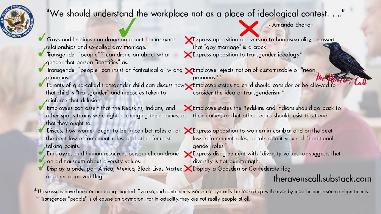 Conversely, various practical considerations, as demonstrated in cancel culture, effectively deter ordinary citizens from any utterance that defies received orthodoxy on any number of important social issues. Even attempts at maintaining relative anonymity often fail. Those who condone the current regime of onerous civil rights laws, most notably Title VII, incredulously speak of a “workplace free of political contest,” but these laws have in fact promulgated both a set of government agencies and a human resources hive mind that permits certain, favored expressions while sanctioning others with loss of employment and livelihood. As set forth in “Power, Naïveté, and Cynicism: Reconceptualizing the First Amendment,” the Equal Employment Opportunity Commission has effectively sanctioned and deterred a wide range of expressive activity both in the workplace and outside of it. In one example, postal workers were prohibited from wearing garments (namely t-shirts) featuring the Gadsden flag, after a black employee complained it created a hostile working environment. That management eventually prohibited such attire did not prevent the EEOC from allowing a complaint to proceed in court. These and other considerations reveal that such blather about “freedom” is largely a chimera. Even worse, the body of so-called civil rights laws prevent Americans from hiring whom they please, living among whom they please, and have effectively gutted and eviscerated any association of freedom that was once enjoyed.