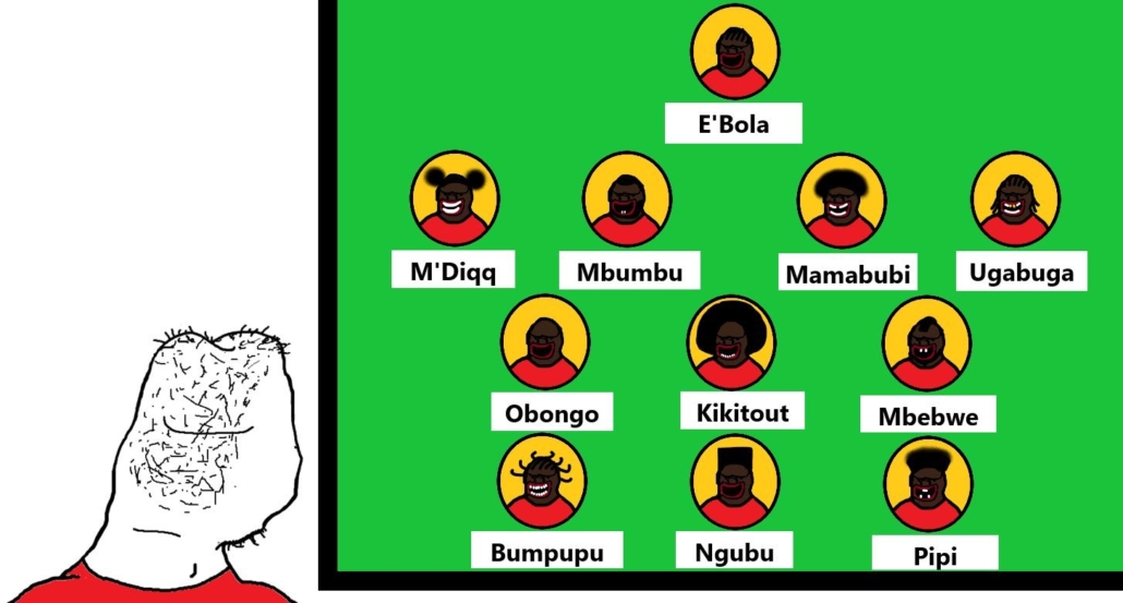 It’s particularly grotesque to see White fans supporting so-called English teams with many or even mostly Black players. It’s the sporting equivalent of inter-racial cuckold porn, the pornographic sub-genre where White men gain perverted pleasure from watching Black men have sex with their White wives or girlfriends. Just as sex is a pleasure properly intended for the reproduction of children and the enhancement and celebration of a pair-bond, so spectator sport is a pleasure properly intended for the reproduction, enhancement and celebration of local community and culture.[3] But Blacks are — and are intended to be — the dissolvers of White communities and culture. They’re an acid, not an enhancer. Ordinary White soccer-fans instinctively understood that when Blacks began to enter English soccer prominently in the 1970s. Unfortunately, those fans protested in uncouth ways that must have pleased the hostile elite. Making monkey-noises and throwing bananas at skilful, stoical Black players did not help the White cause. The instincts were right; the execution was wrong. The uncouth protests helped the imposition of Blacks on the British Isles.