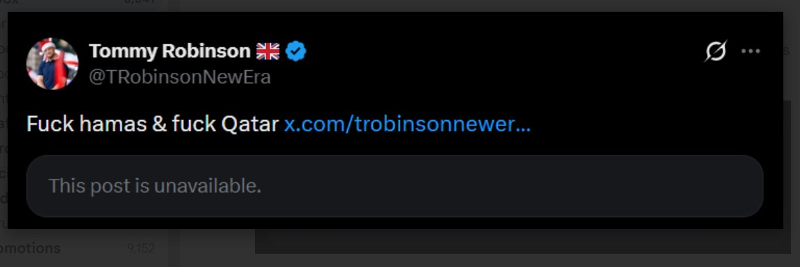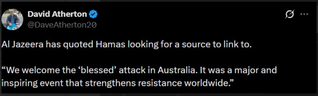 Tommy quickly took down his post claiming that Hamas had praised the Bondi attack