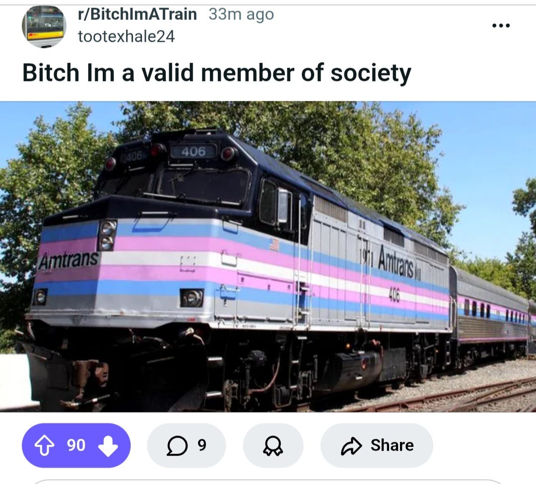 Nor is it the case that transgender ideology has lost favor in leftist strongholds, from certain social media platforms to coastal elites. A brief examination of reddit and TikTok alike reveals that transgenderism is still quite prevalent in these and other social media platforms. In addition to subreddits that pertain specifically to transgender nuttery, a brief perusal of reddit reveals that posts celebrating or boasting transgender identity as well as transgenderism writ large occur quite often. This is true even, most especially, in subreddits that have nothing whatsoever to do with this pariah afflicting modern society. Indeed, posts celebrating transgenderism appear fairly regularly on otherwise mainstream subreddits, including subreddits pertaining to football and even r/bitchimatrain, the purpose of which is to showcase pictures, videos and other media depicting trains in a variety of sensational contexts, from colliding into cars left stranded at crossing gates to any number of matters.