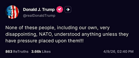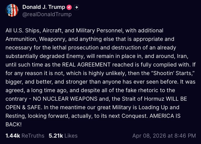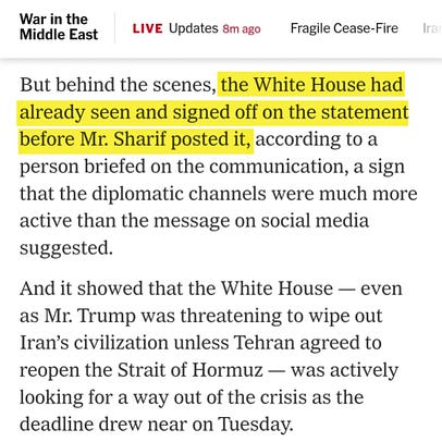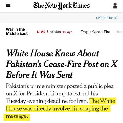 Second came Trump’s inability to conceal his rage at the shambolic failure and Iran’s refusal to submit, which led to his vulgar, profanity laced “civilization ending” social media tirades over the weekend. In my speculation, a line in the establishment must have been drawn. The reset required not only a pause to retool militarily but also politically. Thus the ceasefire theater. The desperation for a ceasefire—before Iran could call Trump’s deadline bluff—was so serious that the US was forced to accept Iran’s maximalist position. That, of course, has been discarded amid a blizzard of lies. But the truth is out:
