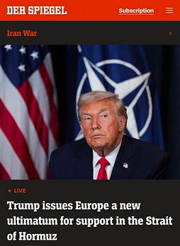 Trump has renewed his efforts to arm twist the NATO countries into what looks like a suicidal attempt at a blunt force reopening of Hormuz.