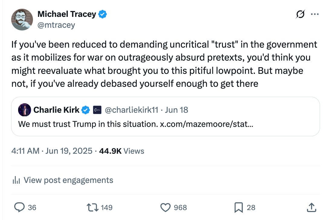 His conduct was even more egregious in the run-up to Trump bombing Iran in June. During that episode, he pretty much served as a blatant government disinformation agent. Harsh as that might sound after he was brutally gunned down yesterday, it’s simply true. His mission was to demand uncritical faith in the US government, during a time of war — which is totally inexcusable for anyone who would consider themselves anything even remotely approximating a “journalist.” But that’s clearly not what Charlie Kirk considered himself. He instead considered himself a government media mouthpiece. On April 3, he said “A new Middle East war would be a catastrophic mistake.” Then by June 17, as drumbeats for the joint US-Israeli war against Iran were intensifying to full volume, Charlie changed his tune to mollify Trump, whom his whole identity was built around sycophantically serving. “It is possible to be an extreme isolationist,” Charlie Kirk warned his massive audience. “President Donald Trump is a man made for this moment, and we should trust him.” This was just pathetic. Turn off your critical thinking skills and place unquestioning “trust” in the US government to wage a war on false pretenses! What awesome, noble “truth-telling”!