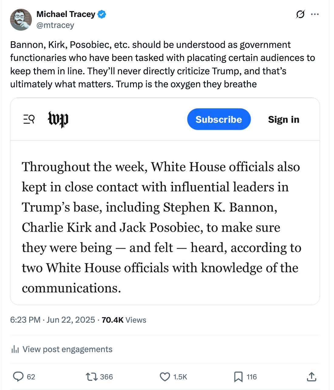 I’d occasionally read pieces by Michael Tracey, a prominent moderate or liberal-leaning Internet writer and the day after Kirk’s death he published a harsh 1,400 word column providing a very different perspective on Kirk.